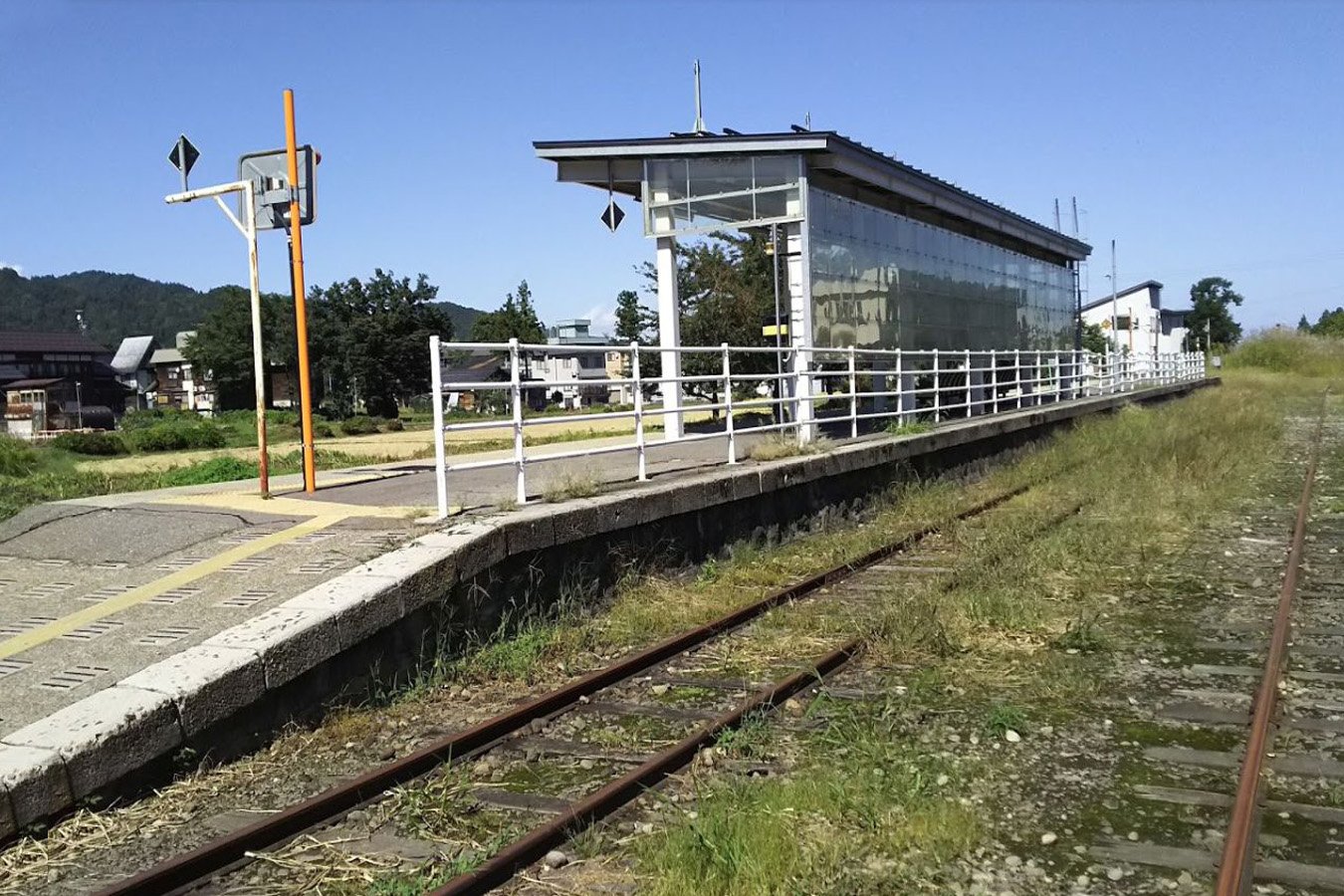 当駅は、かつては島式ホーム1面2線を有していましたが、現在は駅舎側の1線が廃止されて単式ホーム1面1線を有する地上駅になっています。駅舎とホームの間に側線が残っています。