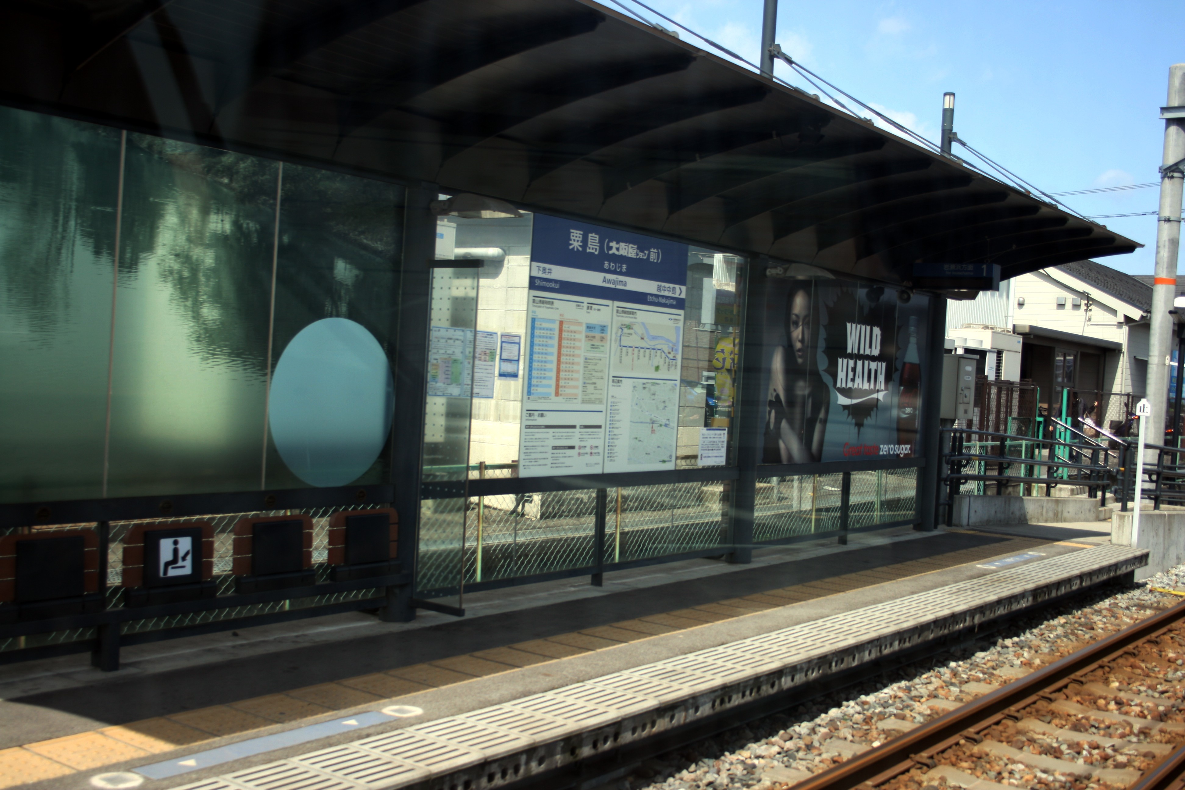 なお、当駅の駅名標では漢字表記を「粟島(大阪屋ショップ前)」としつつ、読み表記は「あわじま / Awajima」のみとするレイアウトとなっており、括弧付きでない表記が使われている事例の一つとなっています。
