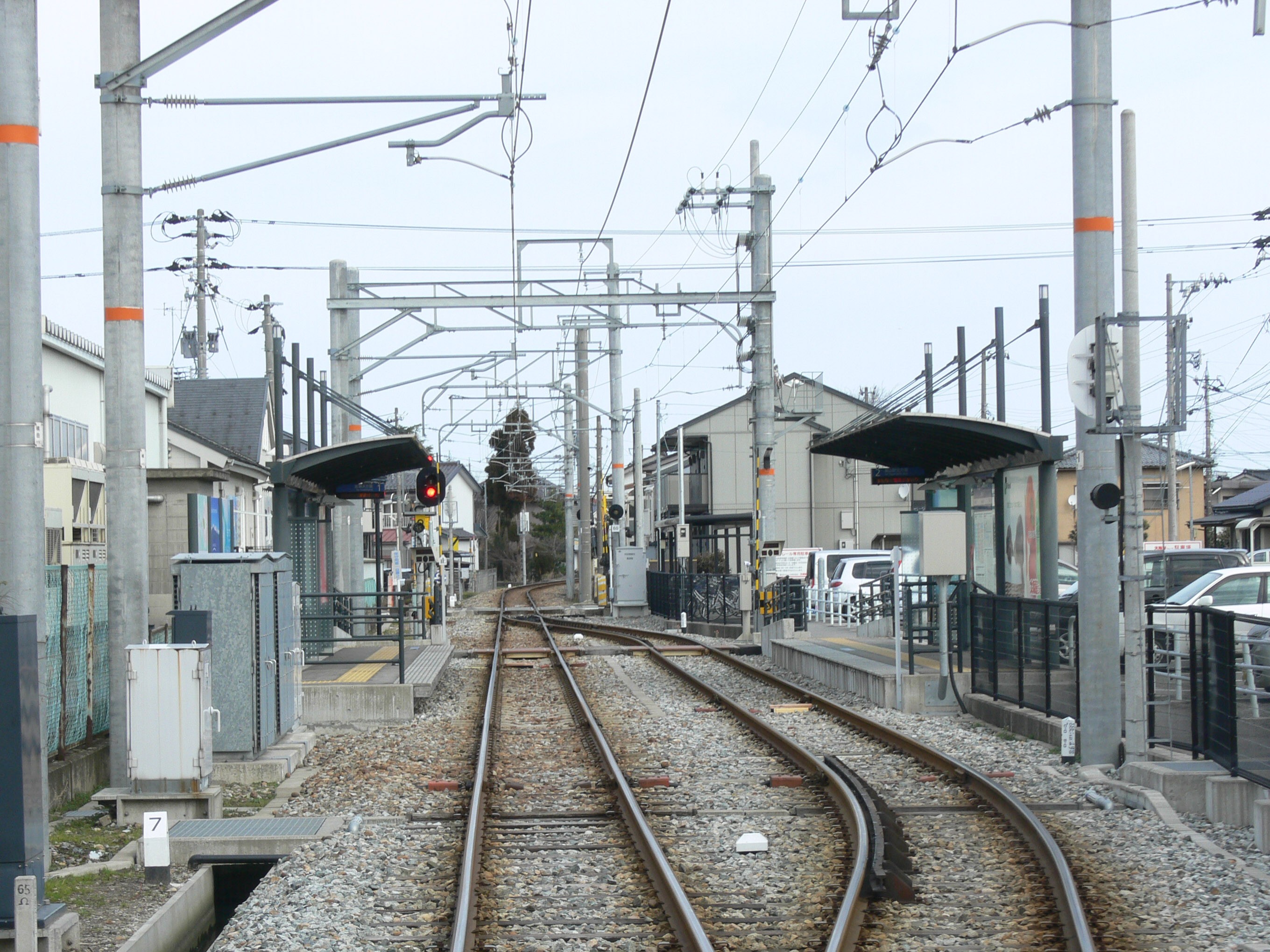 当駅北側には曲線区間があり、上り列車が構内に進入する際の見通しが良くないため、上り用の場内信号機の手前には、当線では唯一の遠方信号機が設置されています。(いわゆる予告信号機ですね)