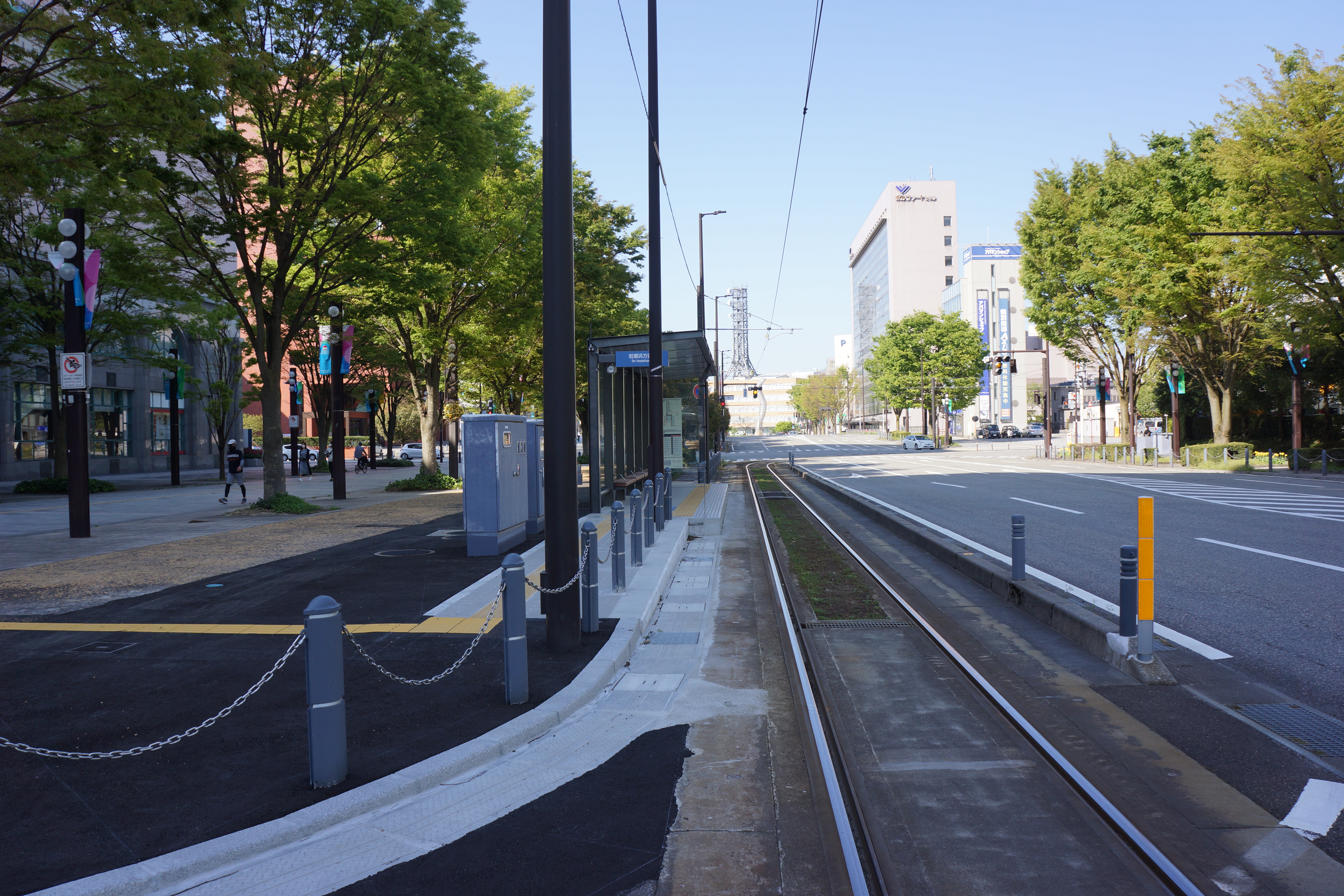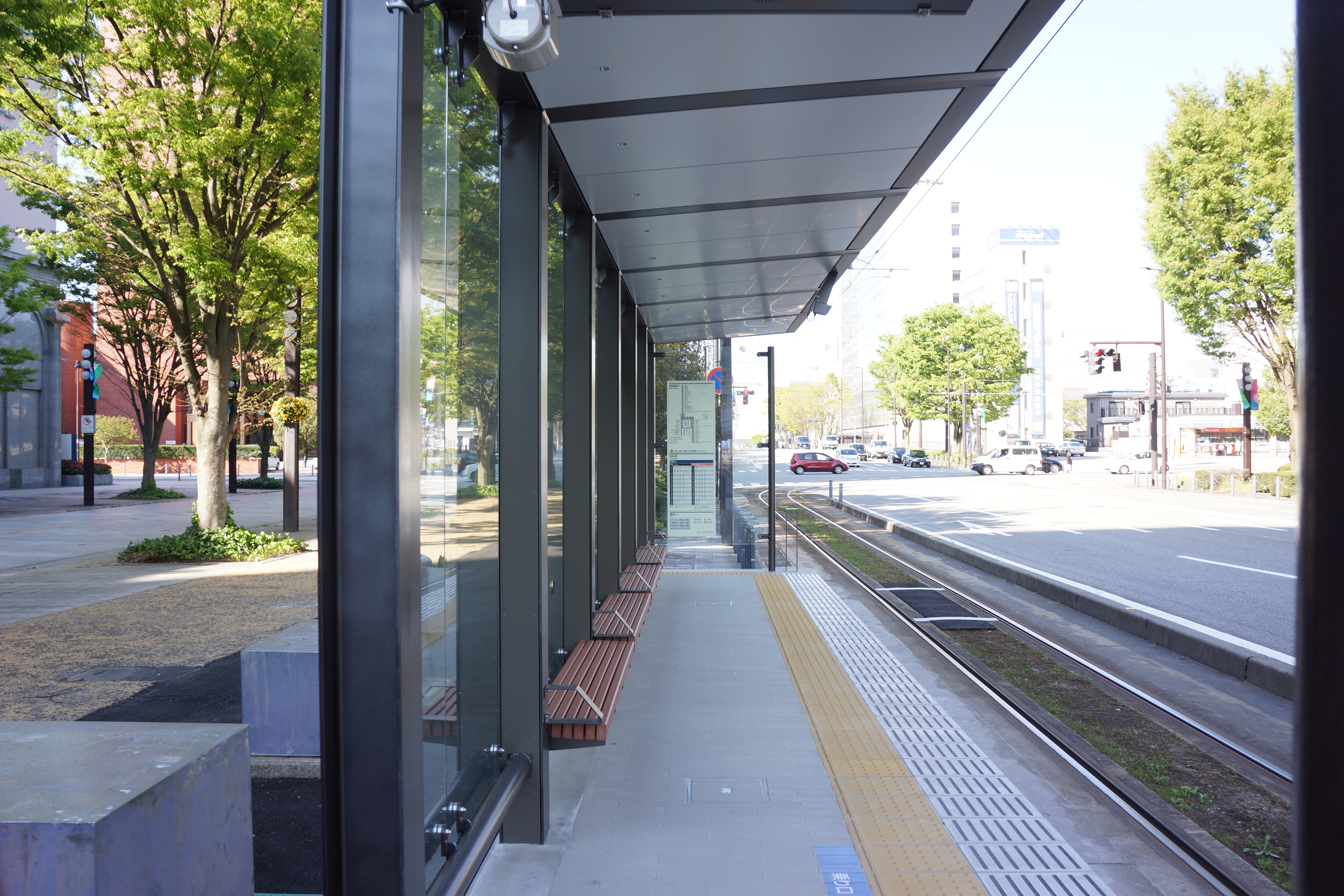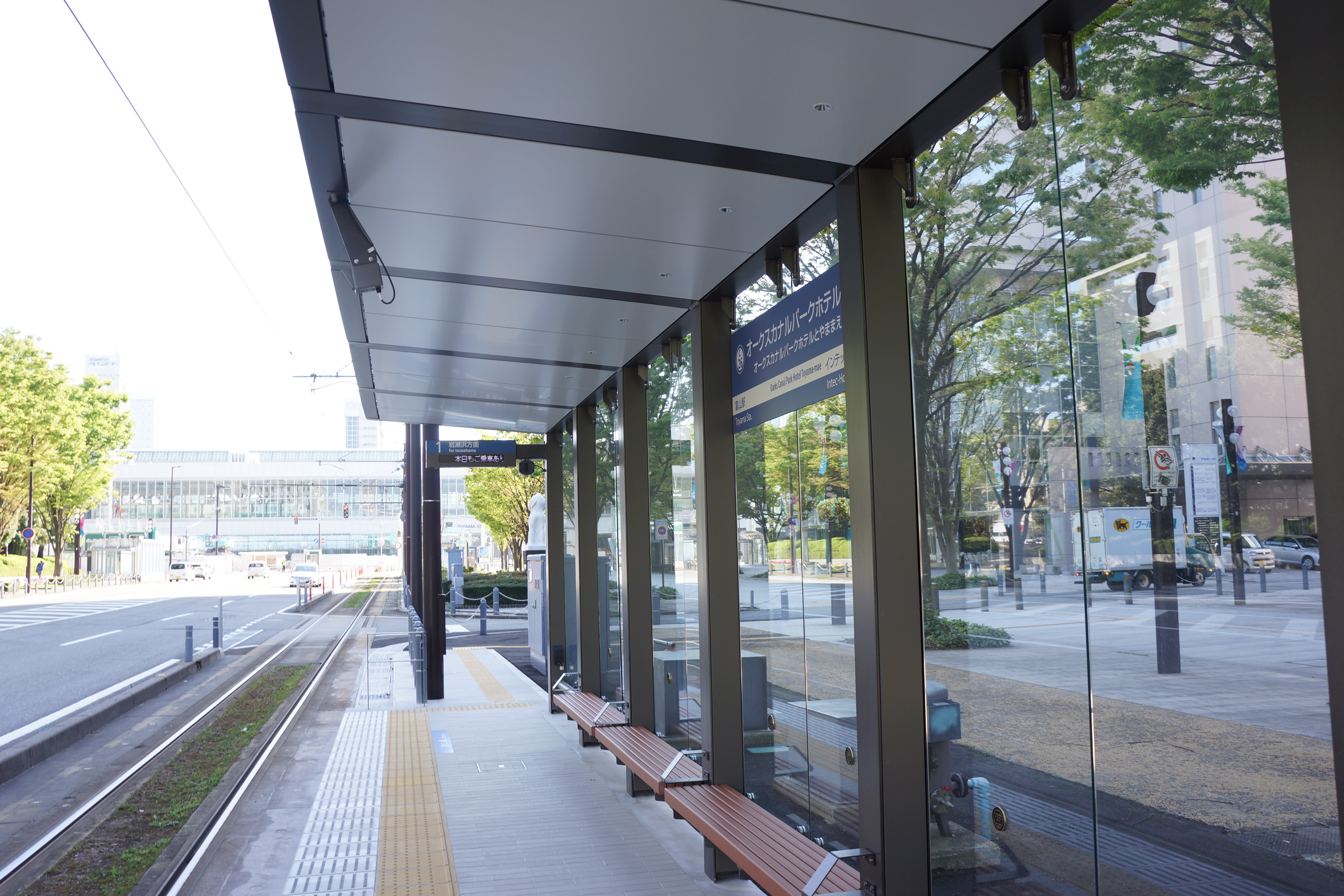 逆方向の富山駅方面は進行方向左側が車道にあたり、ホームや安全地帯が設けられていないため停車しません。