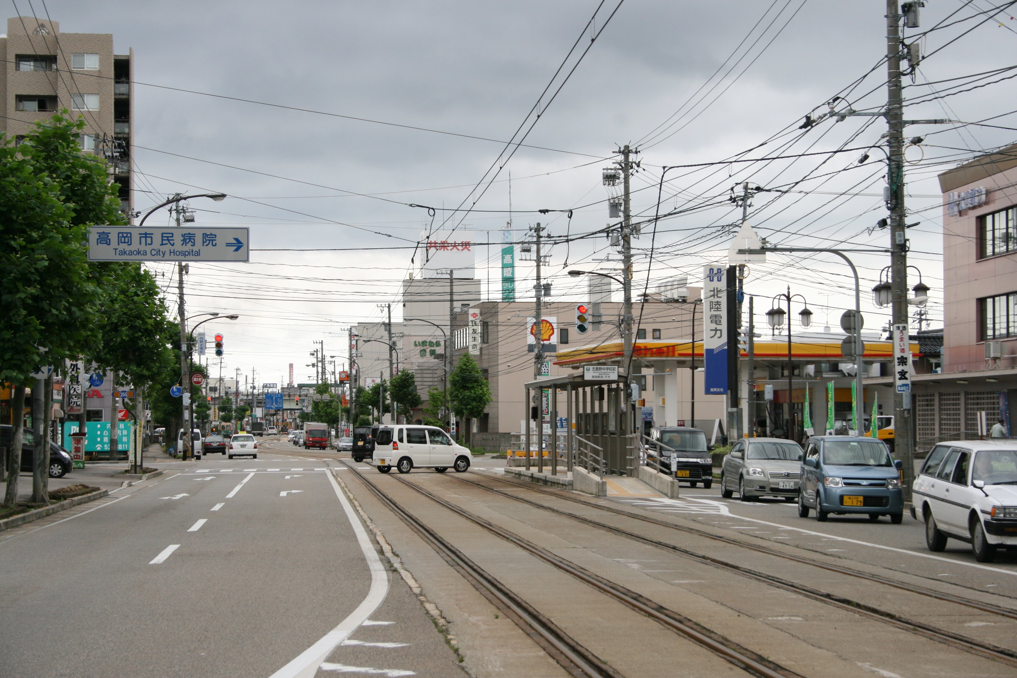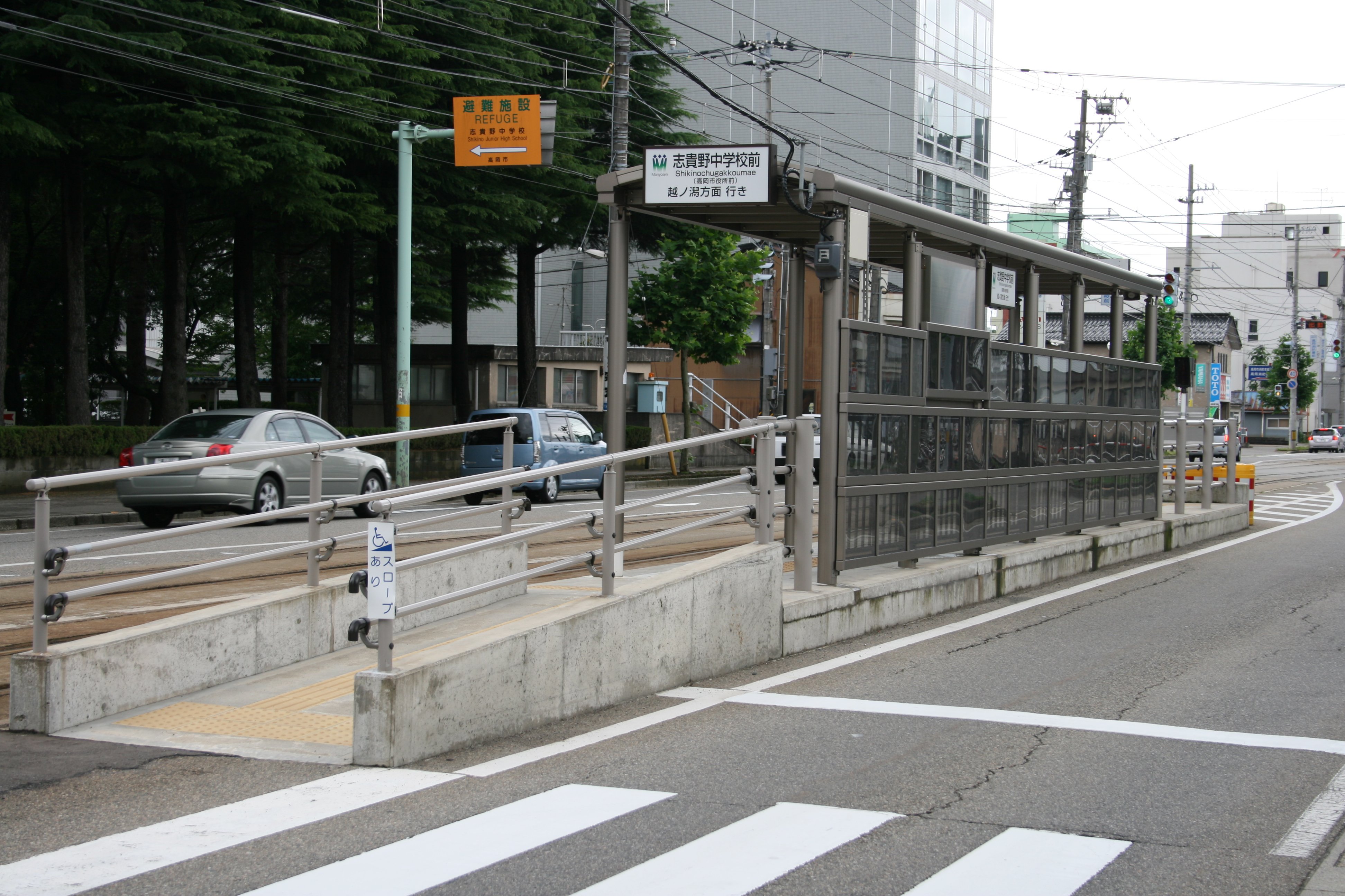 | 志貴野中学校前停留場(しきのちゅうがっこうまえていりゅうじょう)は、富山県高岡市あわら町・広小路にある万葉線の停留場です。高岡市役所の最寄り駅であり、高岡市役所前という副駅名があります。