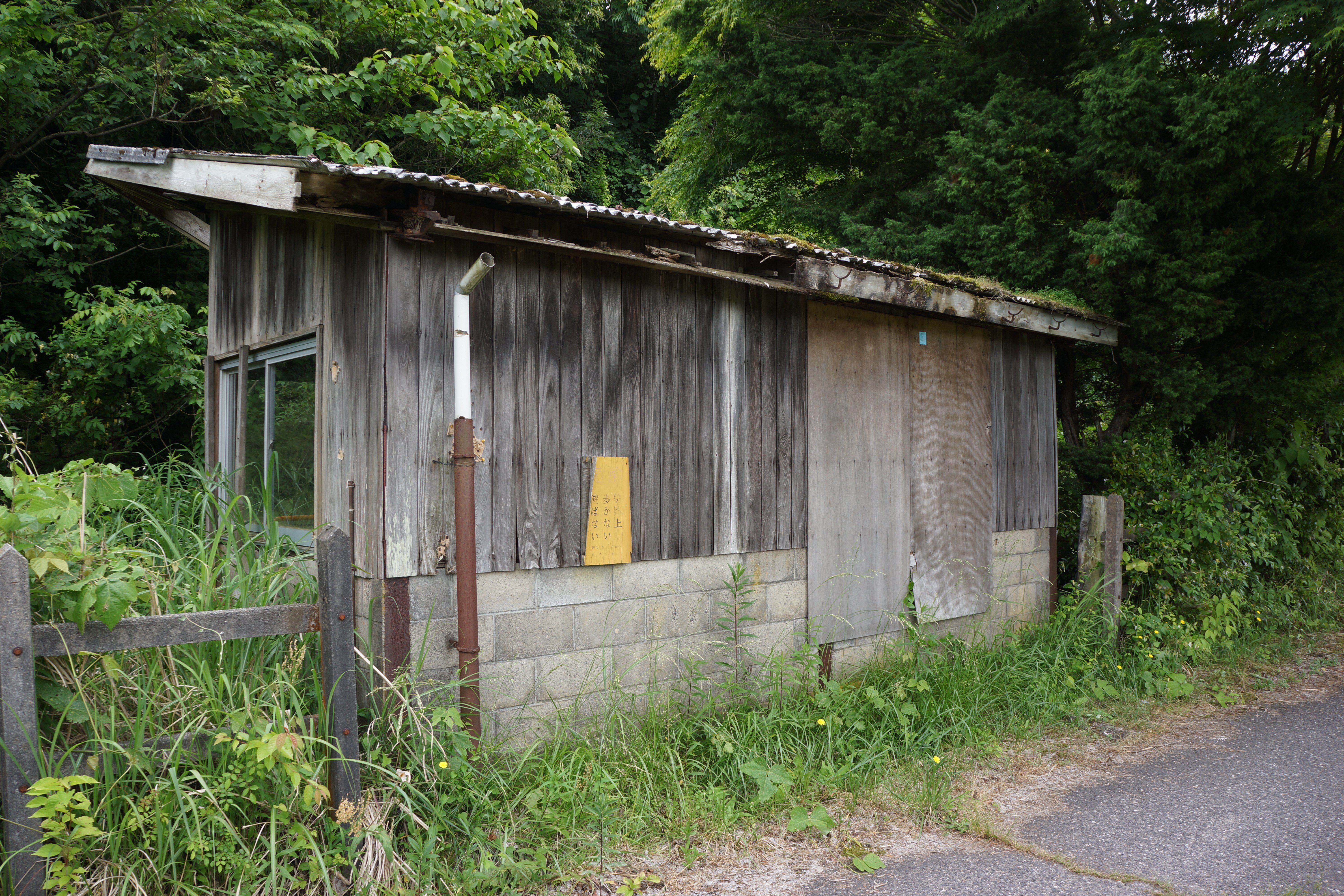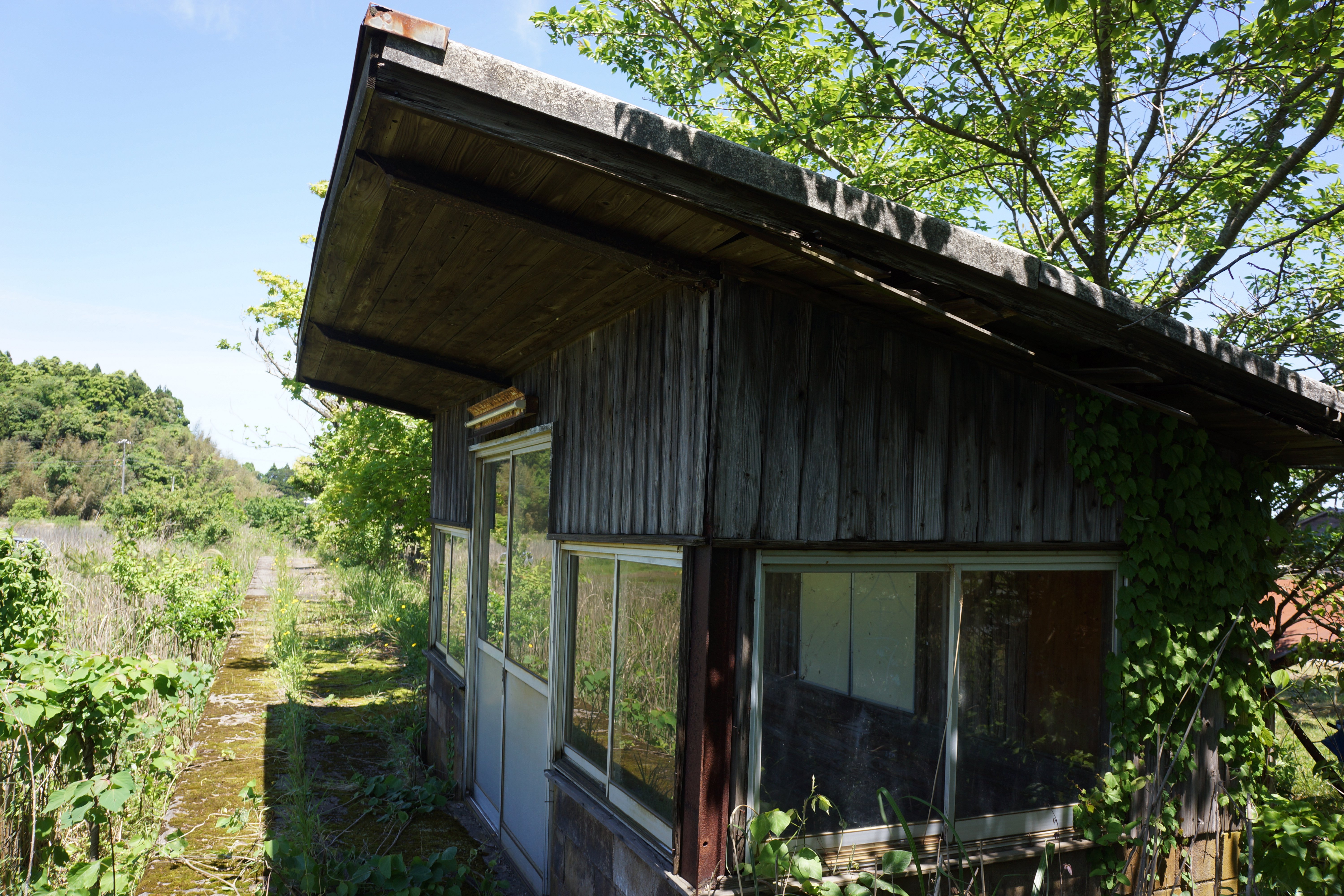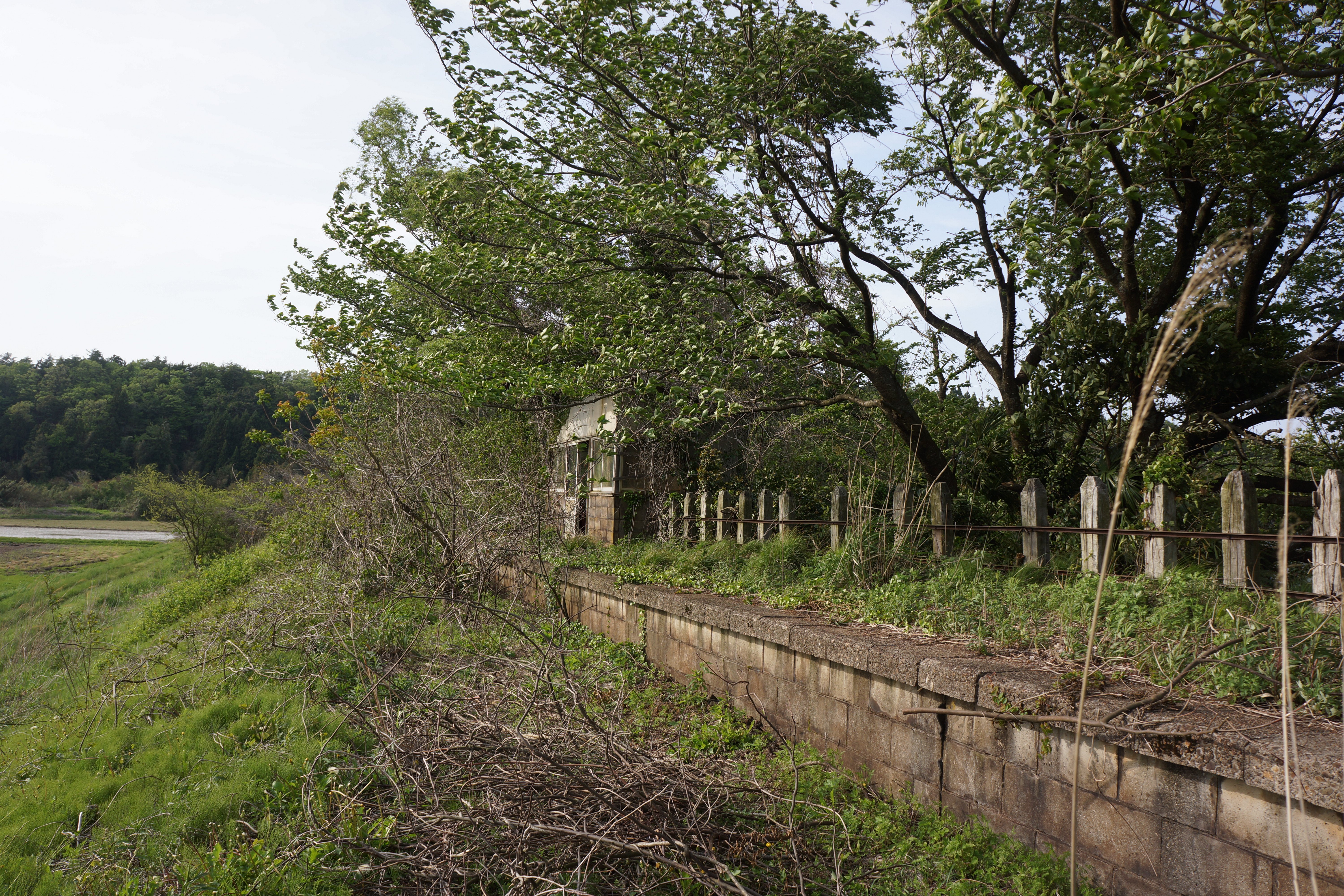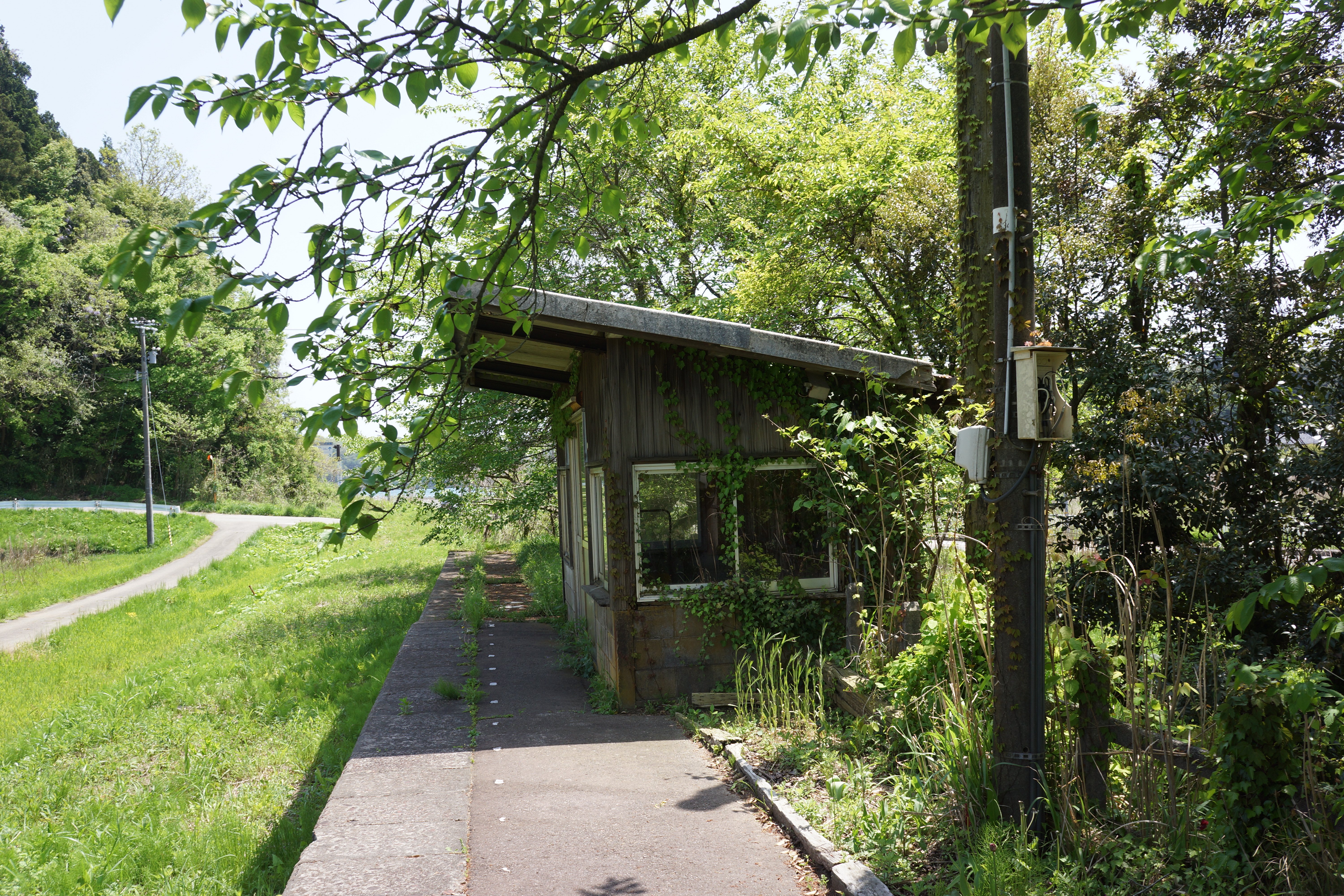 次の九里川尻駅は待合所とホーム、自転車置き場もありましたが、いずれも荒廃していて打ち捨てられていました。