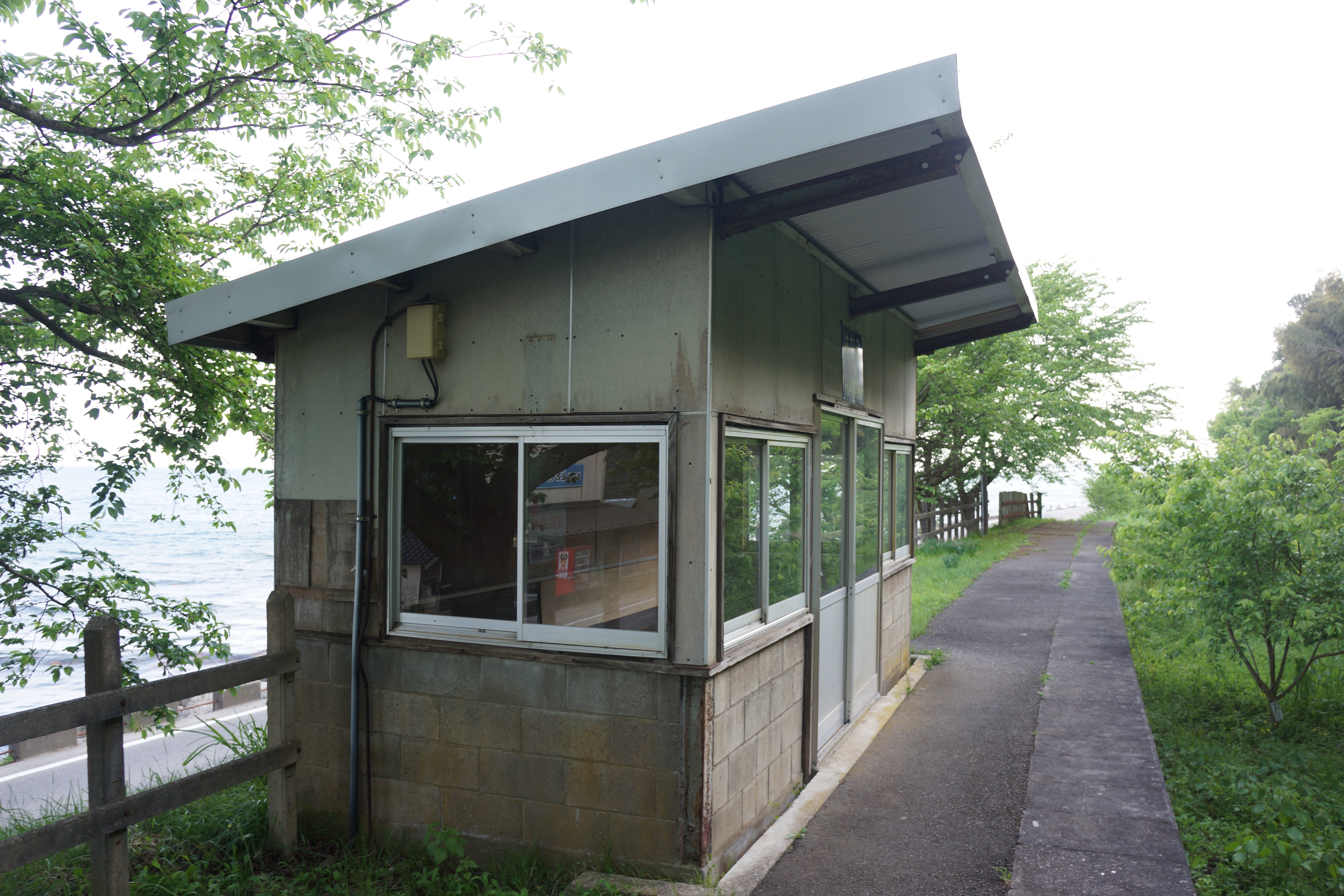 次の小浦駅は、集落から見るとかなり高い地点にあり、そこへたどり着くのが大変でした。待合所もホームも健在で、整備されているという印象でした。