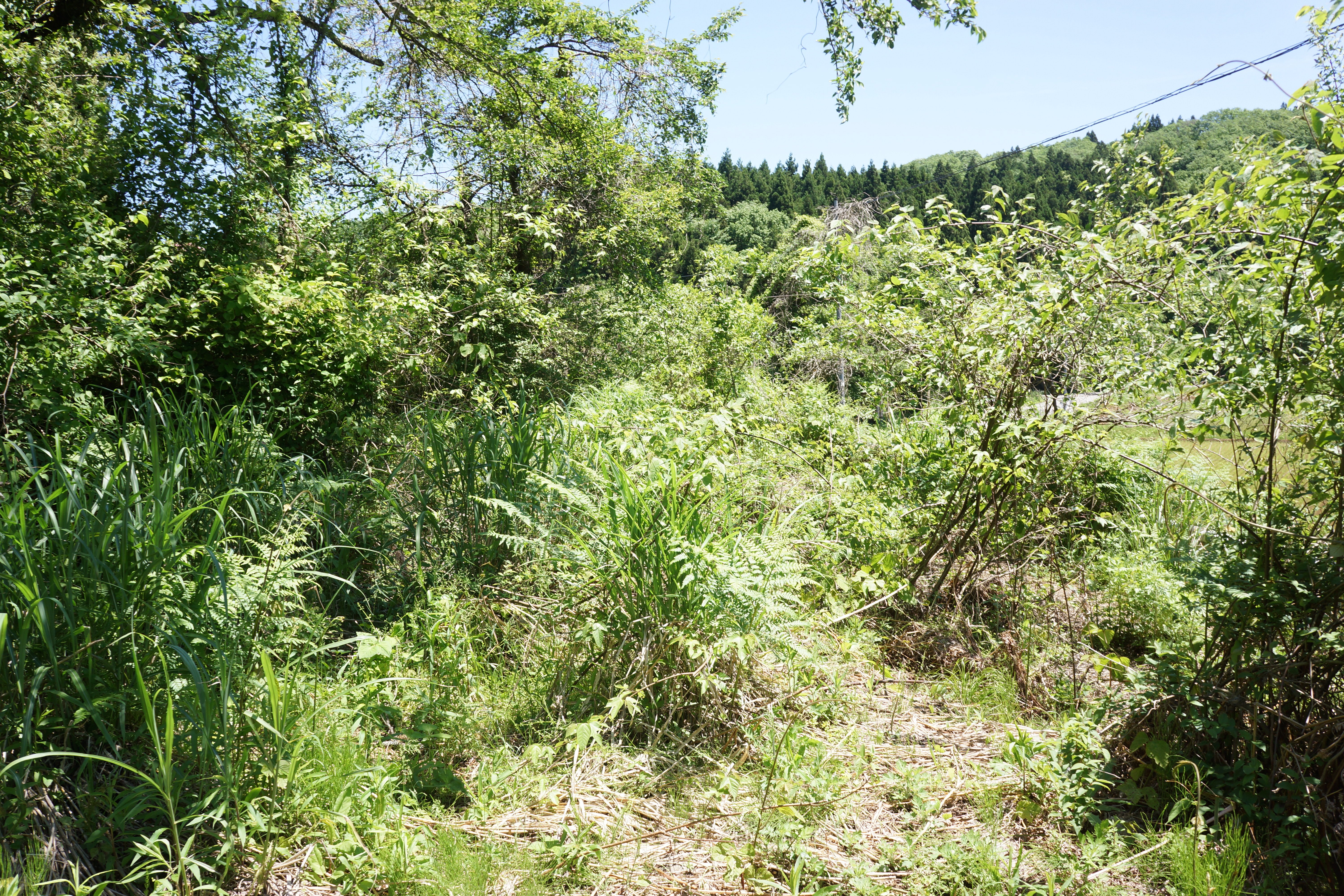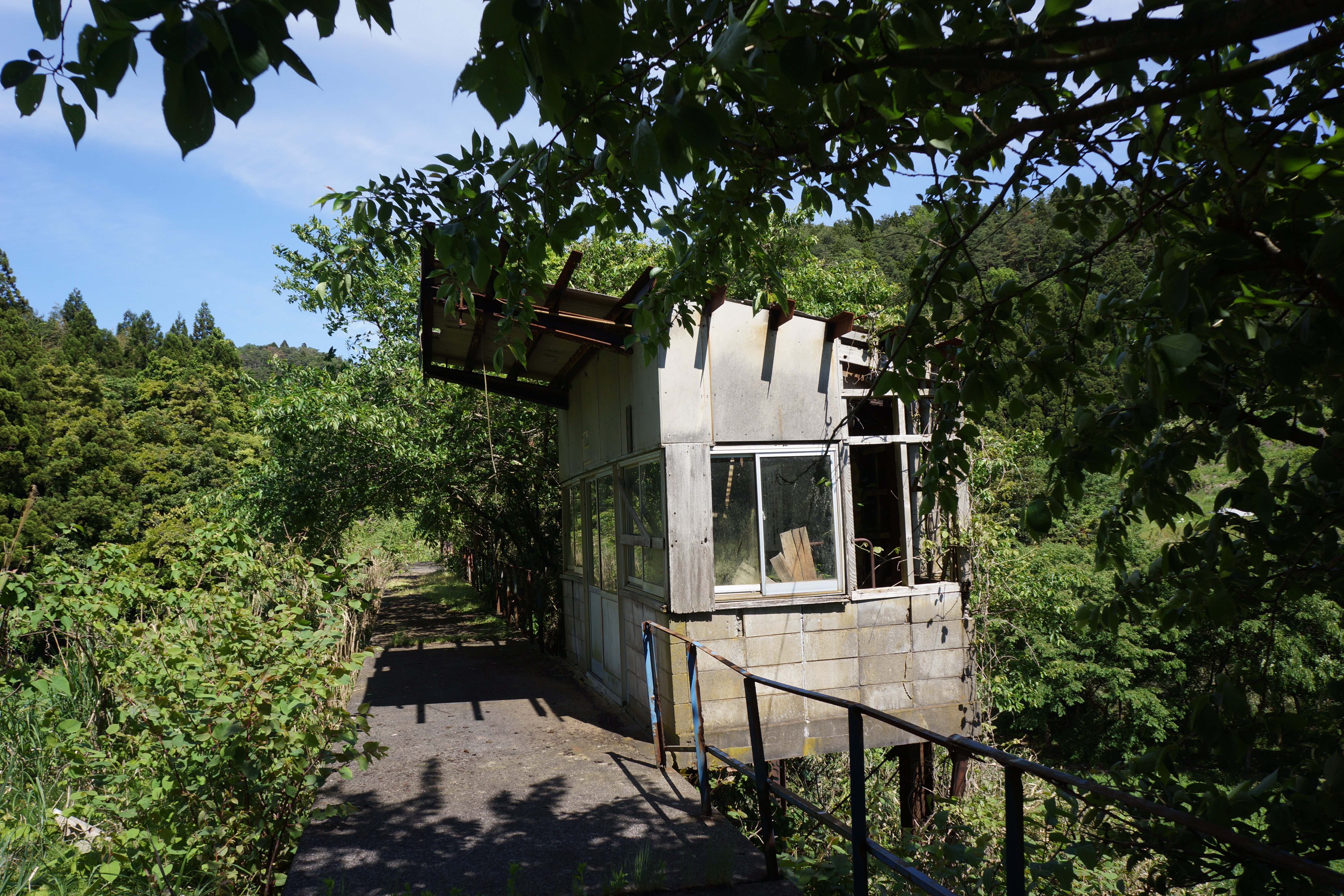 この鹿波駅は周囲に全く人家がなく秘境駅と言えるシチュエーションですが、なぜこんなところに駅を設置したのでしょうか。駅舎もすでに撤去されていて、駅跡とわかるものは何もなかったりします。ただし、すぐ近くに跨線橋跡がありました。ここからさらに甲駅を目指します。