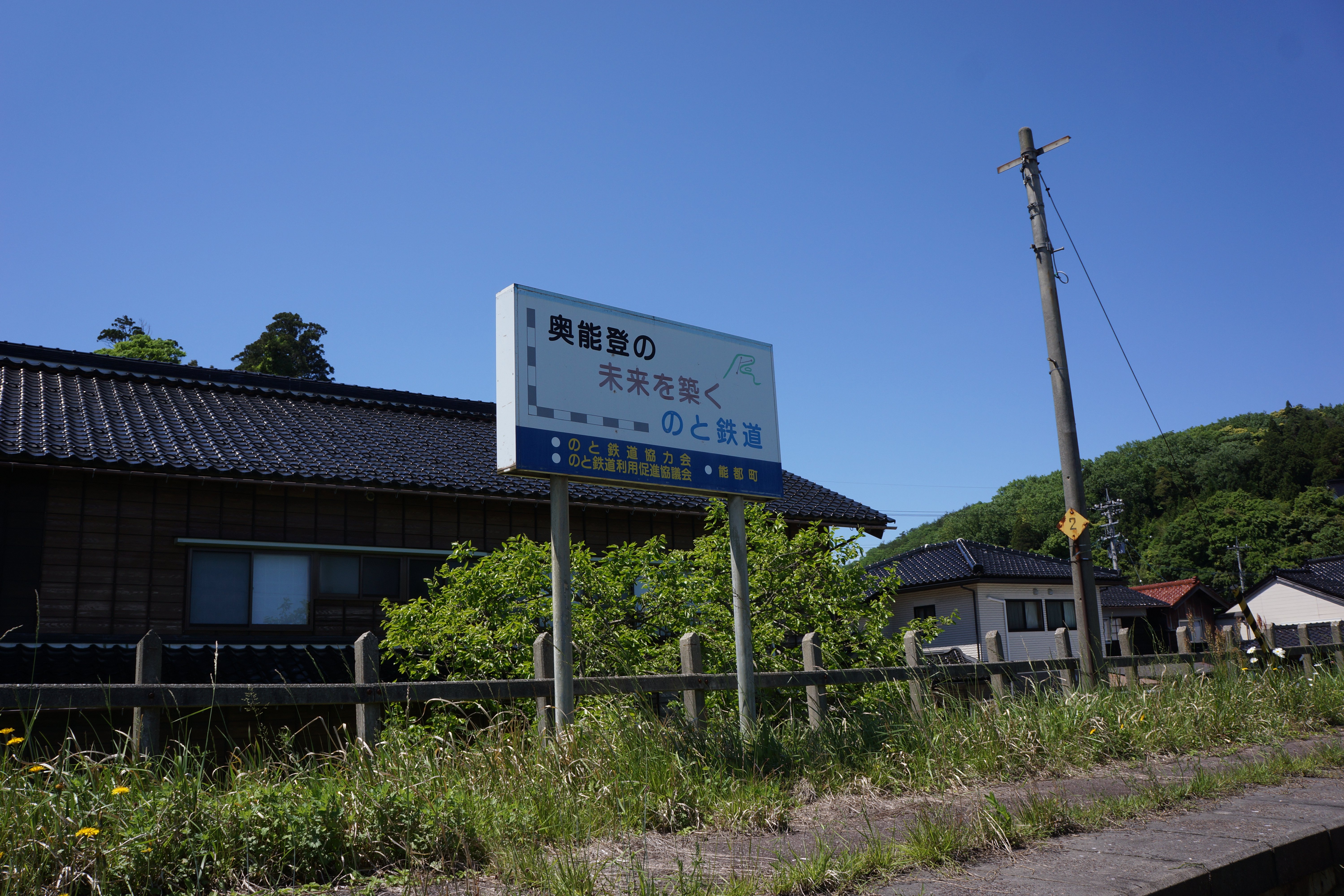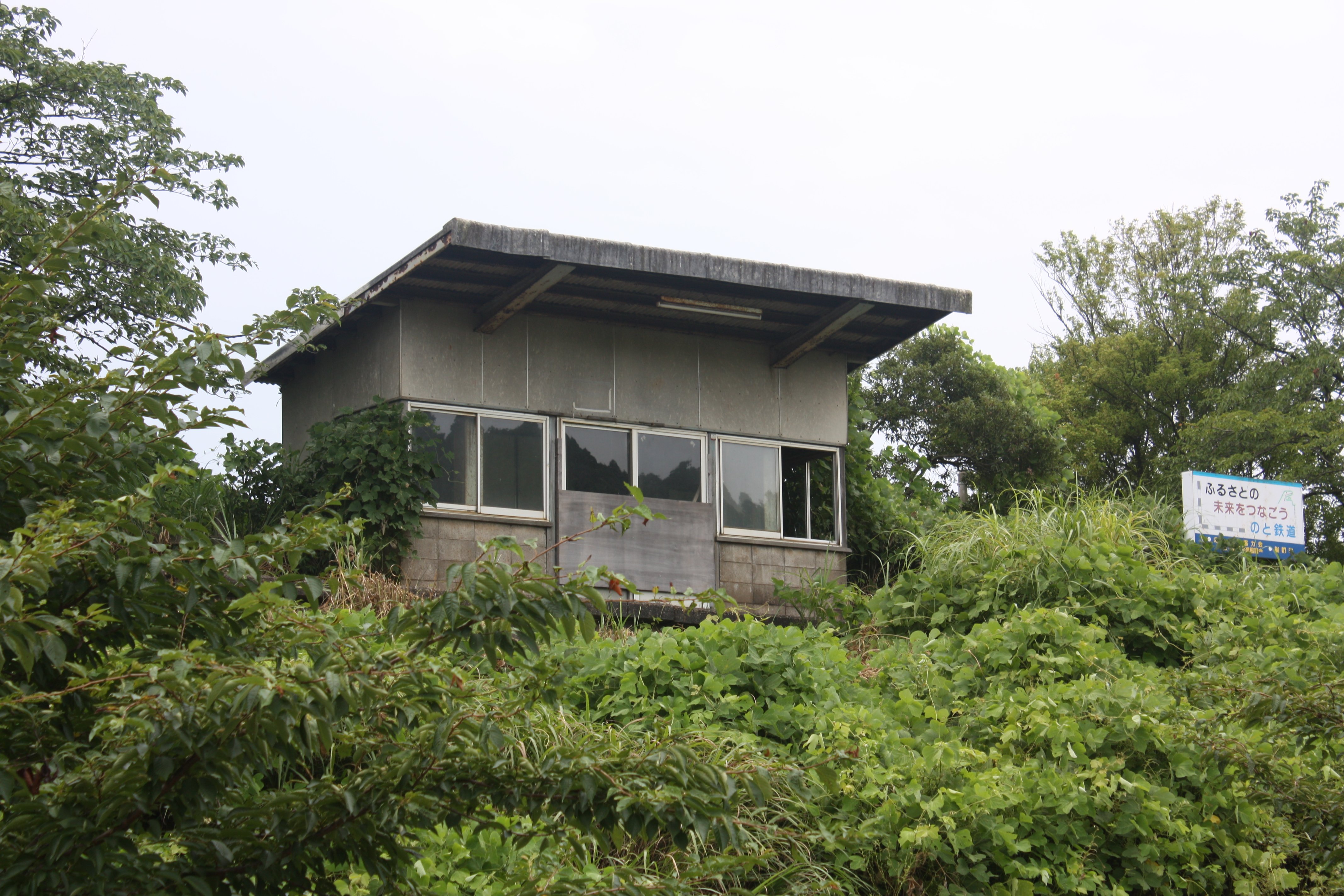 次の縄文真脇駅は真脇遺跡を訪れるには絶好の立地といえるのですが、廃線になってしまっては・・・。駅舎も待合所も現存していてホームも残っていますが、「ふるさとの未来をつなごうのと鉄道」の看板がむなしさを醸し出しています。