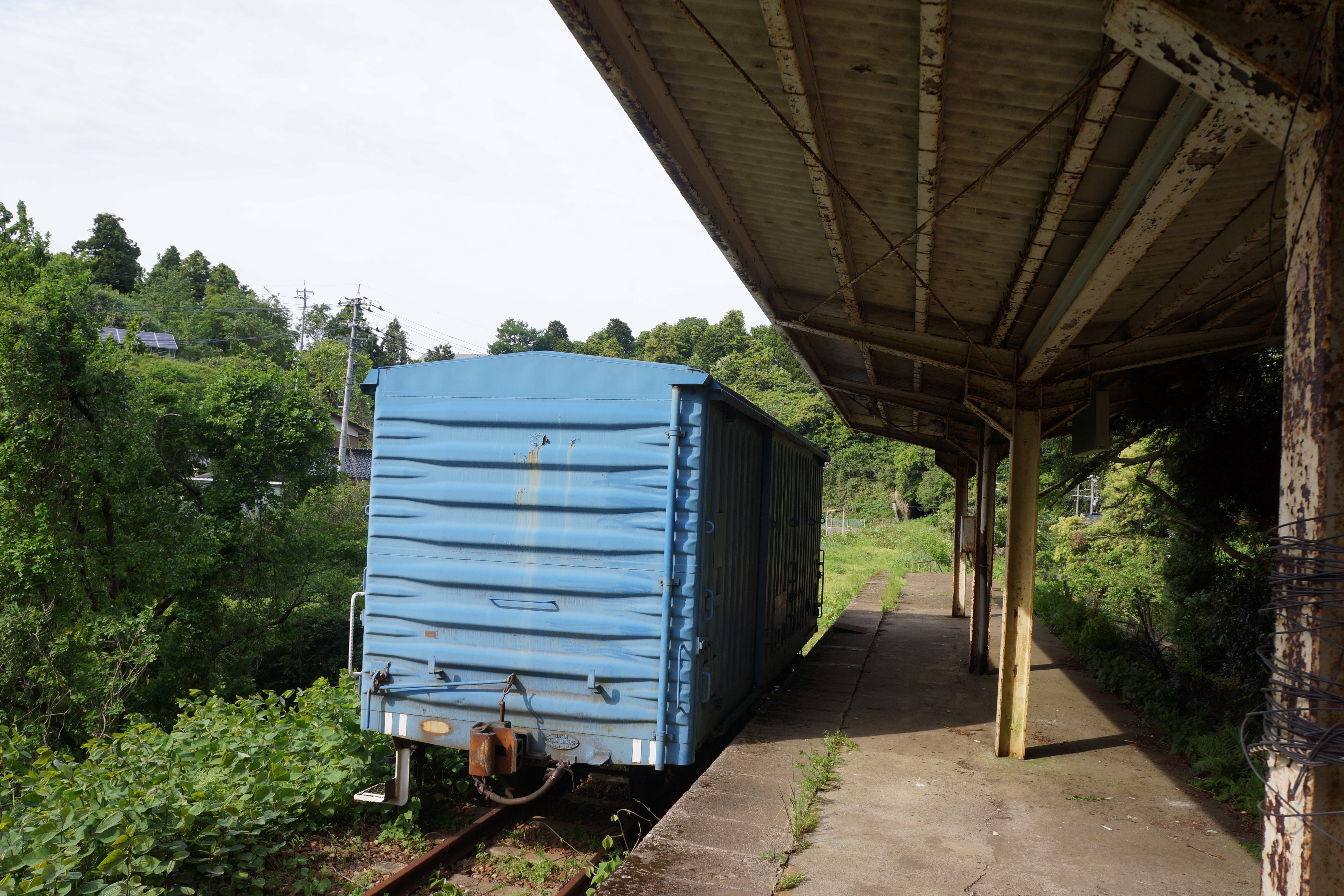 駅舎から階段を上ってホームに来るとなんと貨車が停まっていました。