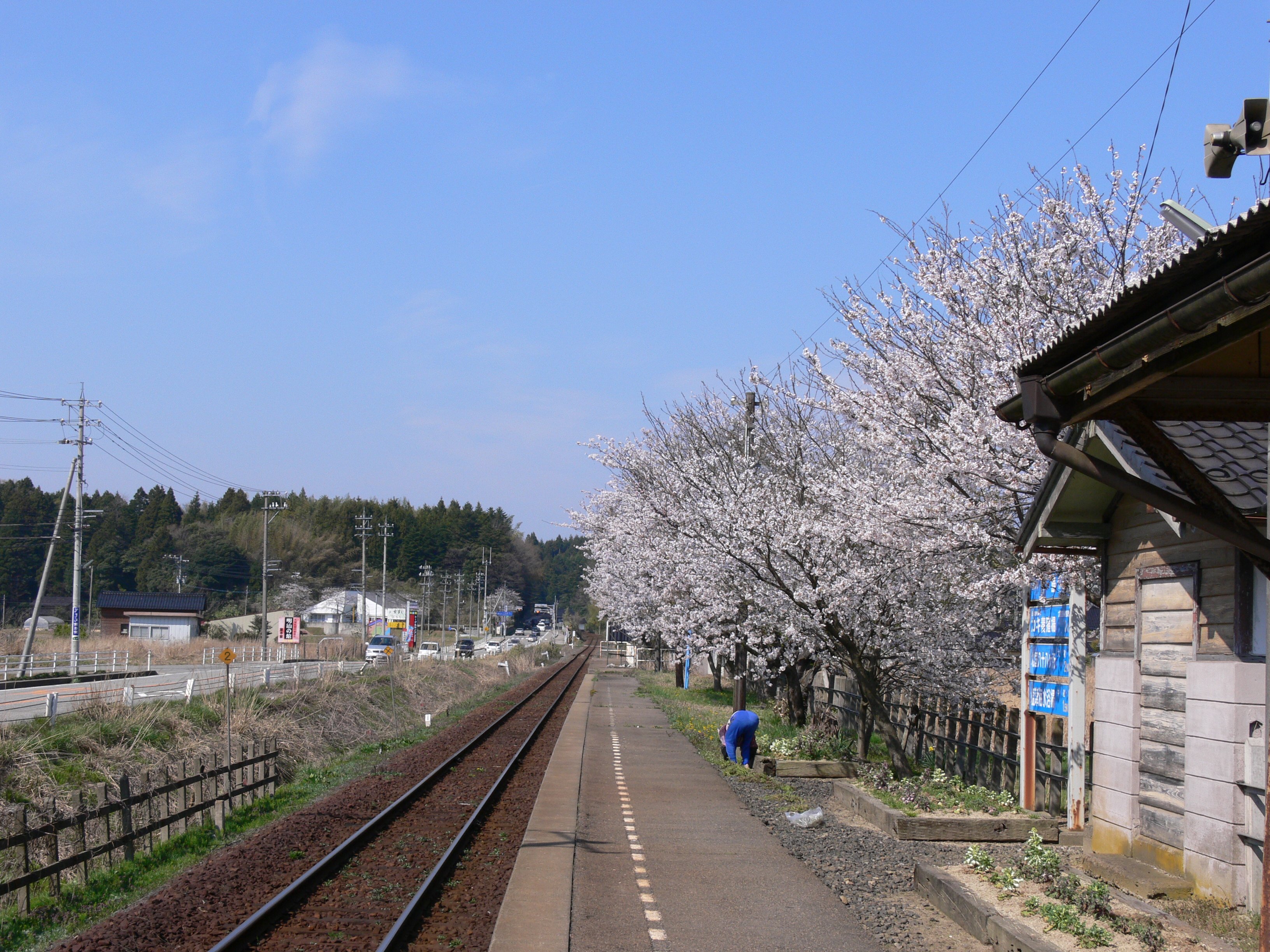 | 笠師保駅ホームに咲く桜 |