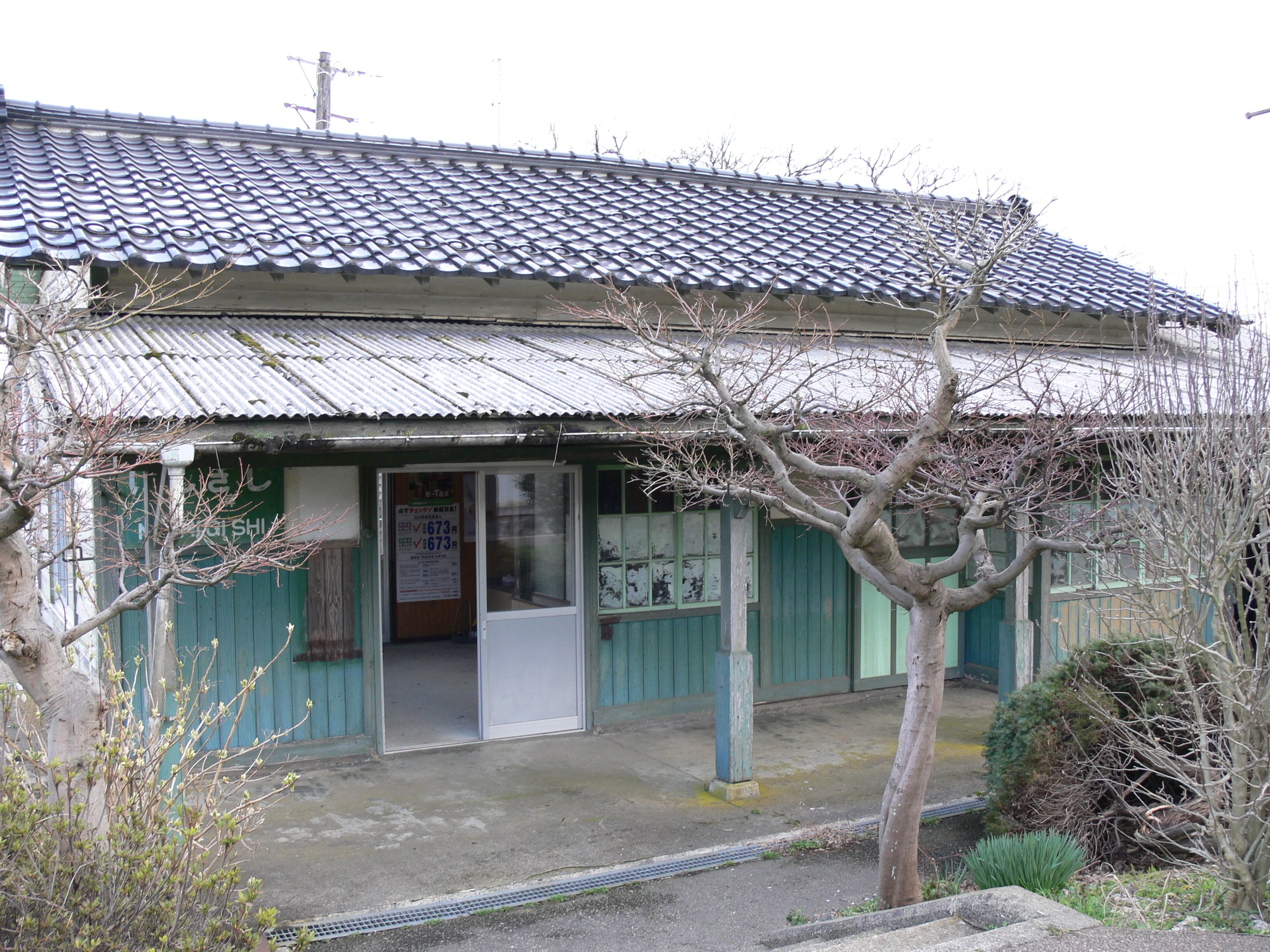 上りホーム側に駅舎がある。跨線橋はなく、駅舎と反対側のホームとの行き来には、七尾寄りの構内踏切を渡る。