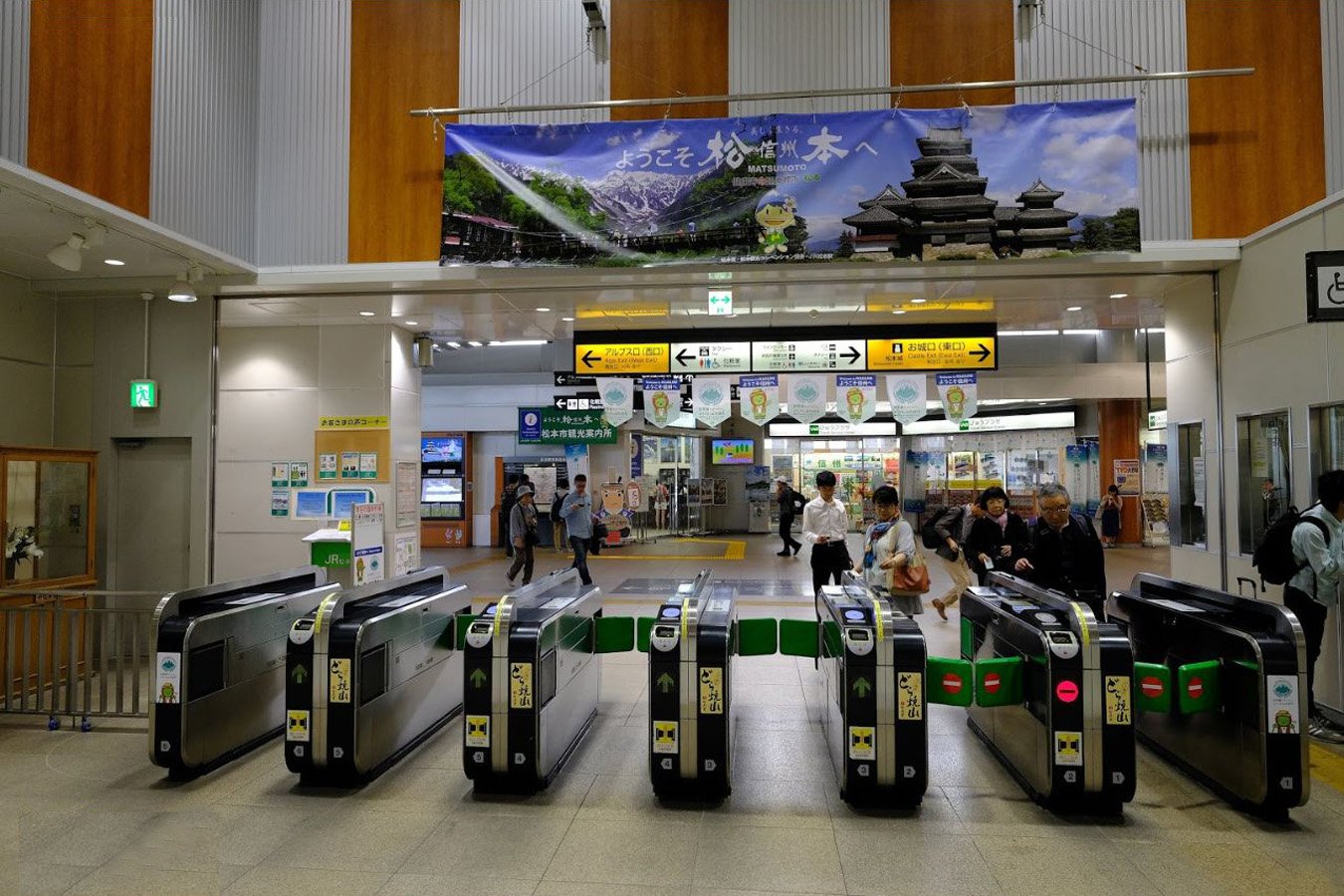 改札の外には、お城口(東口)・アルプス口(西口)それぞれにエスカレーターとエレベーターが設置され、車椅子利用者単独での利用が可能です。