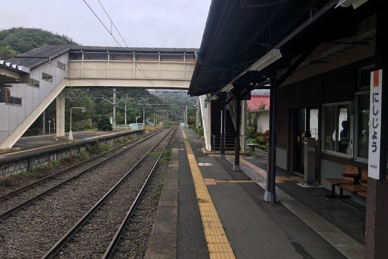 留置線は一部の線路が剥がされ使用できない状態です。互いのホームは跨線橋で連絡しています。