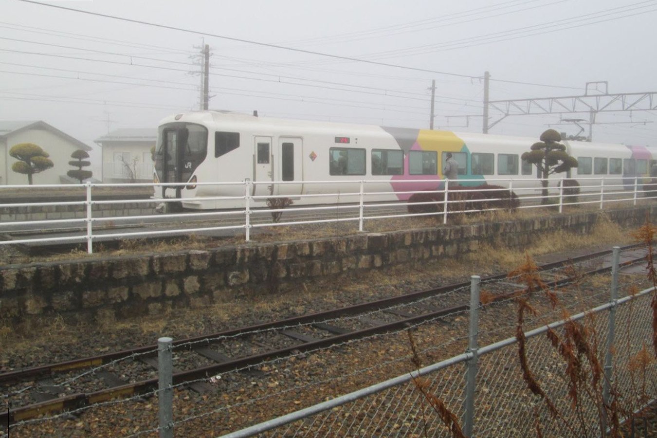 | 霧の中でE257系電車が停車しています |