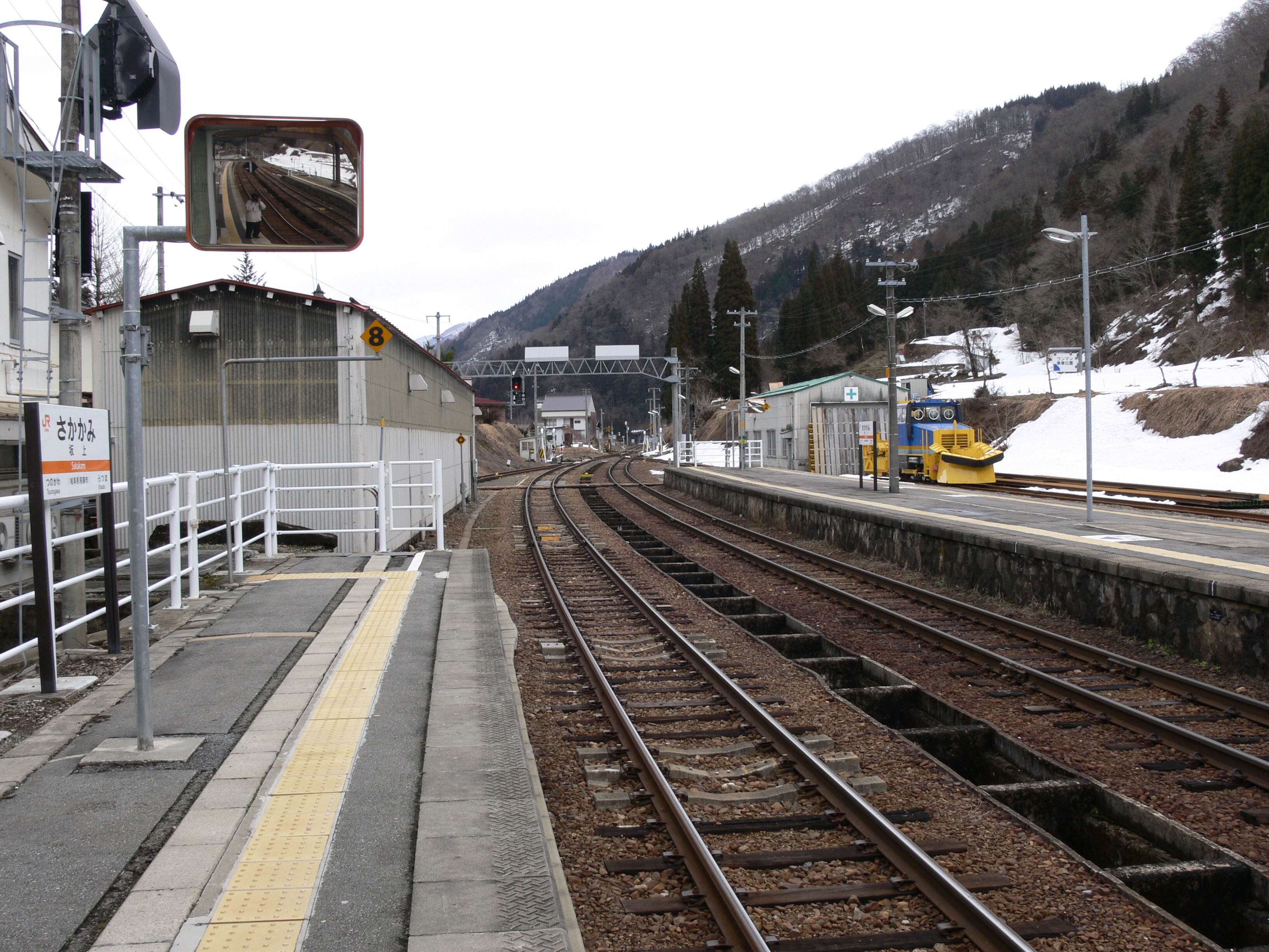 - ホームに接する線路のほかにも、ホームに接しない線路(側線)が東側(猪谷駅方)の上下線それぞれに付属しており、保線車両用の車庫が設置されている。