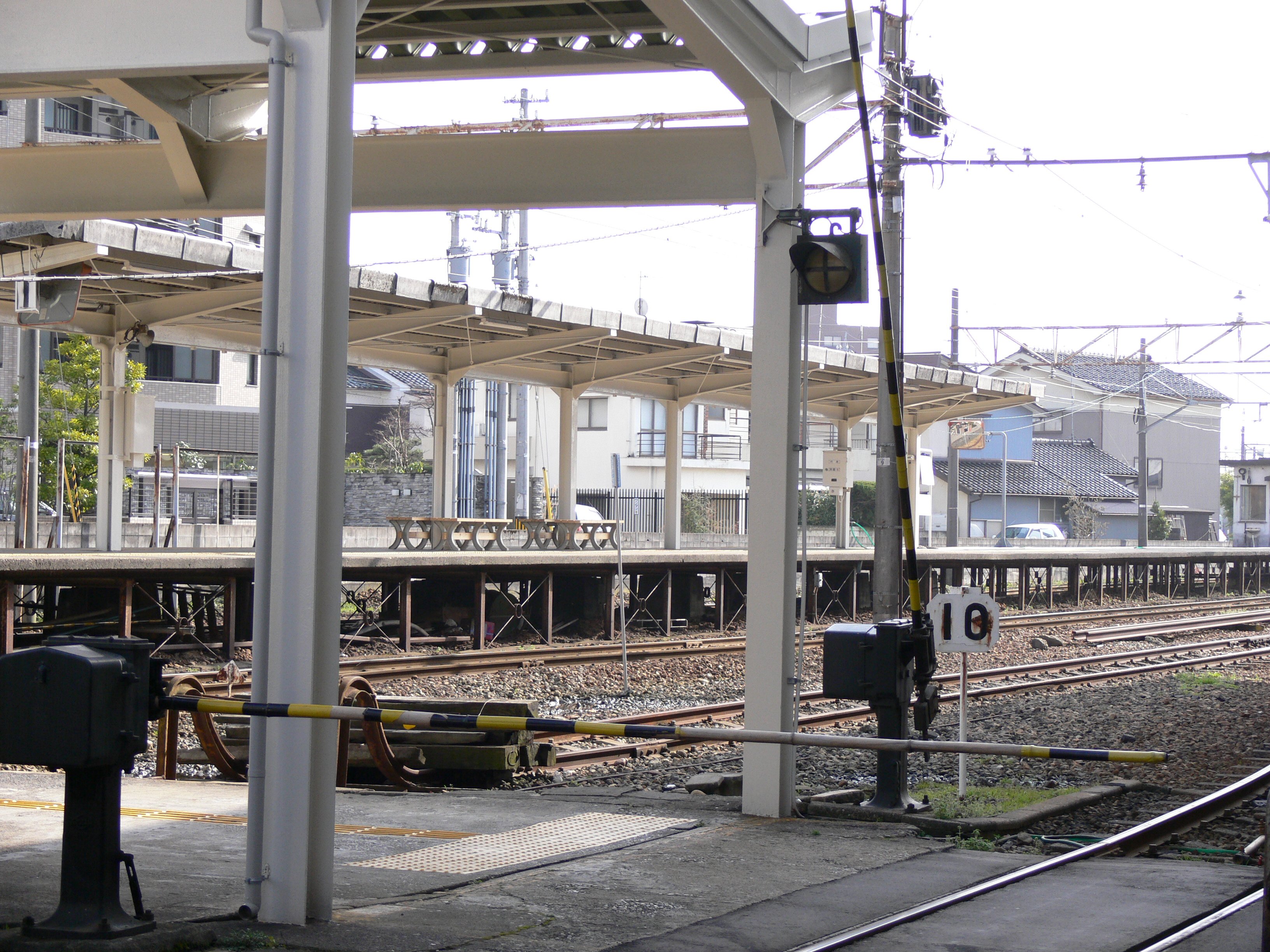 この線路は駅舎と不二越線・上滝線ホームの間の利用者用通路を横切っており、ここの構内踏切は通路側だけでなく線路側にも遮断機が設けられた珍しい構造になっています。