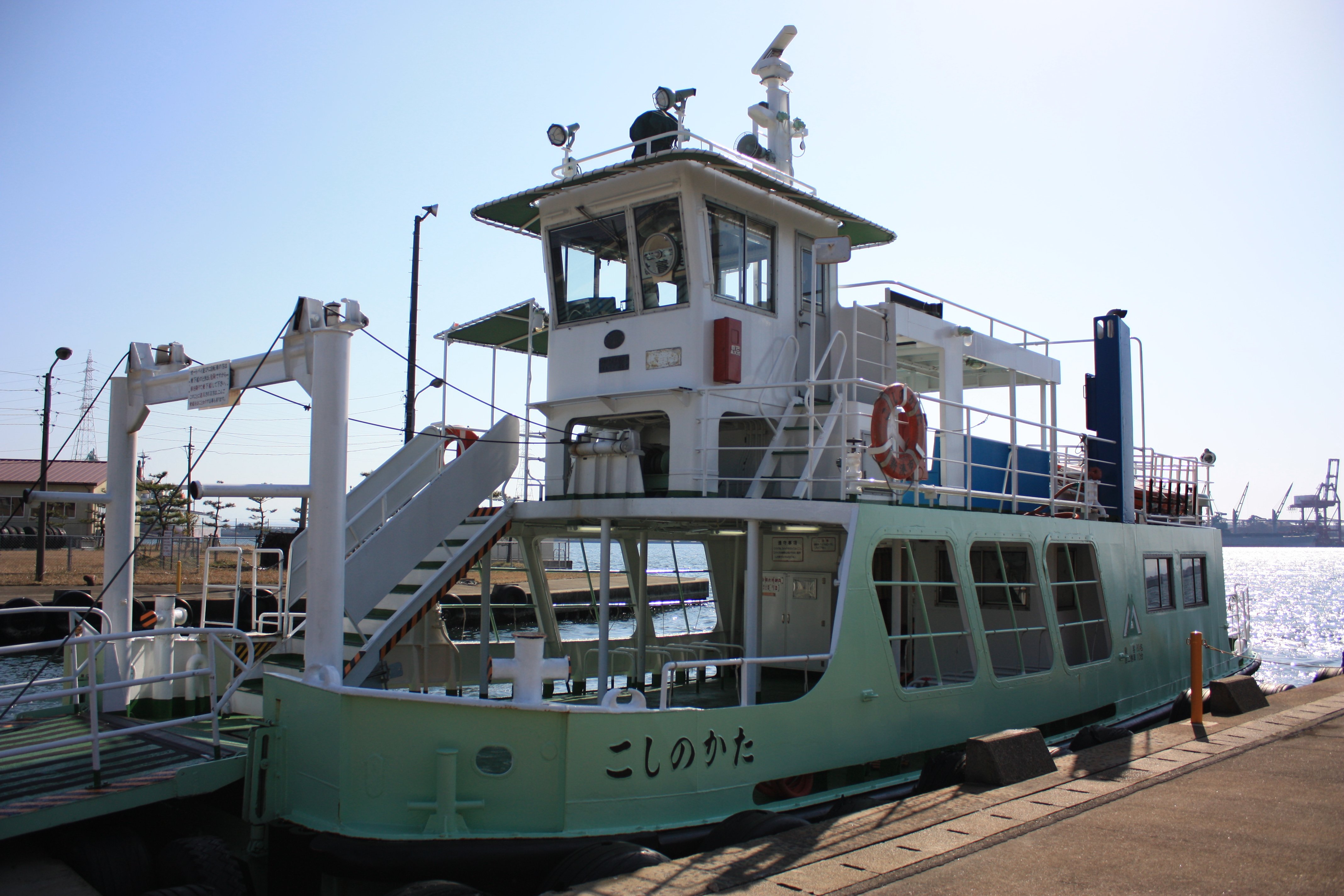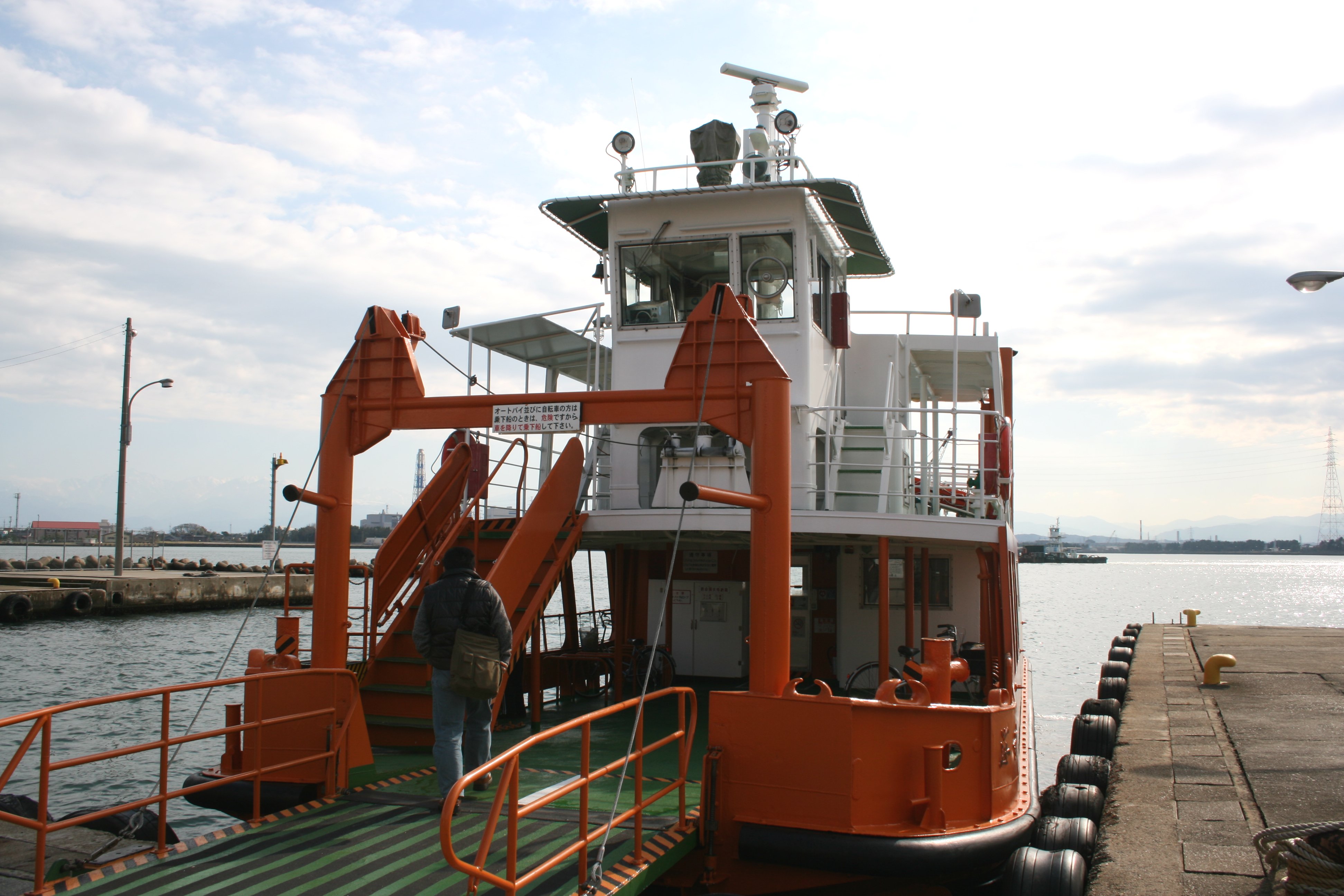 | 富山県営渡船(とやまけんえいとせん)は、富山県射水市の伏木富山港新湊地区(富山新港)を渡る県営の渡し船です。 富山新港内の航路は、越ノ潟~堀岡間770メートル、所要時間約5分です。 通称「越ノ潟フェリー」と呼ばれていますが、自家用車は乗船できませんのであしからず。 富山新港は、潟湖である放生津潟を掘り込んで建設され、昭和43年4月に開港した人工港です。 富山新港が建設される前は、放生津潟の砂州上を富山地方鉄道射水線が通っていたのですが、富山新港の建設に伴い射水線は分断されてしまいます。この際に越ノ潟駅以西は加越能鉄道新湊港線となり、新港東岸側の新港東口駅以東は引き続き射水線として残りました。そして両岸を結ぶため1967年より24時間体制で渡船の運航が開始されましたが、当初は付近住民に無料優待券が配布されたのみで原則として有料でした。また以前と比べ余分に乗り換えの手間を強いることとなったため、射水線(新富山駅~新港東口駅間)の急激な利用者減少を招き、同線は1980年に廃止となり、バス代替となっています。なお、加越能鉄道新湊港線は、現在でも万葉線新湊港線として存続しています。 渡船はその後1986年に完全無料化され1日24時間(118便)体制で運行していましたが、2004年からは利用客の少ない深夜時間帯でジャンボタクシーによる代替運行が行われていて、1日16時間30分(97便)体制となっています。 渡船の航路に平行して「臨港道路富山新港東西線(新湊大橋)」が2012年9月23日に開通し、自転車歩行者道部分である、「あいの風プロムナード」が2013年6月16日に供用開始されたが、種々の問題から渡船の運行も継続されている。 ただし、2014年4月1日からは渡船の運航時間帯がさらに短縮(16時間30分→13時間45分)され、それに伴い97便から69便へと減便が行われています(泣)。ただし運航時間帯のダイヤはほぼ変更なしとなっています。 一方、代替タクシーの運行時間帯は拡大されましたが、深夜時間帯(23:15以降)は申し込み制となっています。