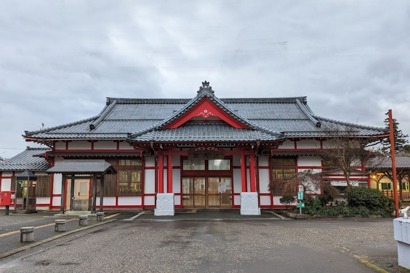 彌彦神社の本殿を模した木造寺社造り(入母屋造)の駅舎は1916年(大正5年)の開業時からのもので、門柱や梁などが朱色に塗色され、鬼瓦には兎が彫り込まれるなど特徴的な意匠を持ち、「ふるさとの駅100選」にも選出されている。