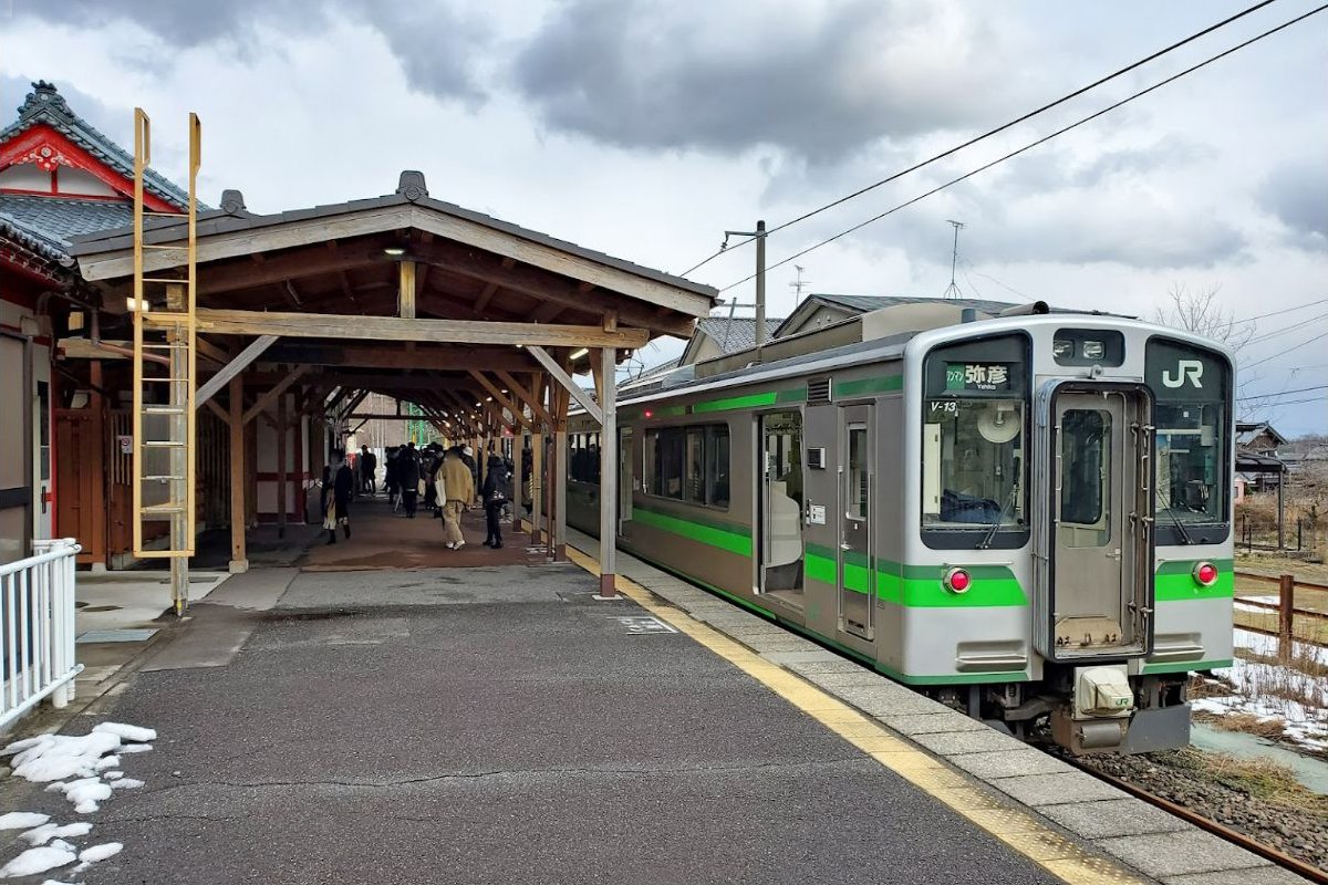 越後国一宮である彌彦神社の最寄駅。弥彦線の起点駅である。